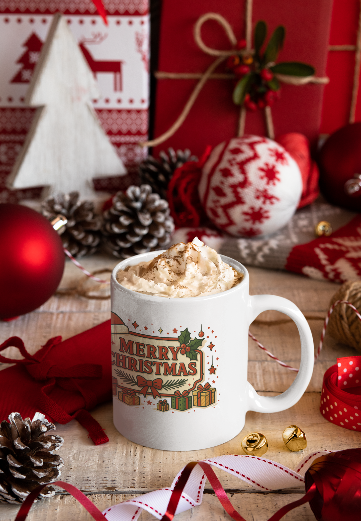 Celebrate the holiday season with this Merry Christmas Ceramic Mug. The glossy ceramic finish and vibrant colors make it a festive addition to your morning routine. Suitable for microwave and dishwasher use, this durable white ceramic mug is available in two sizes (11oz and 15oz) and features a comfortable C-handle. Perfect for anyone looking to add some holiday cheer to their daily coffee or tea!