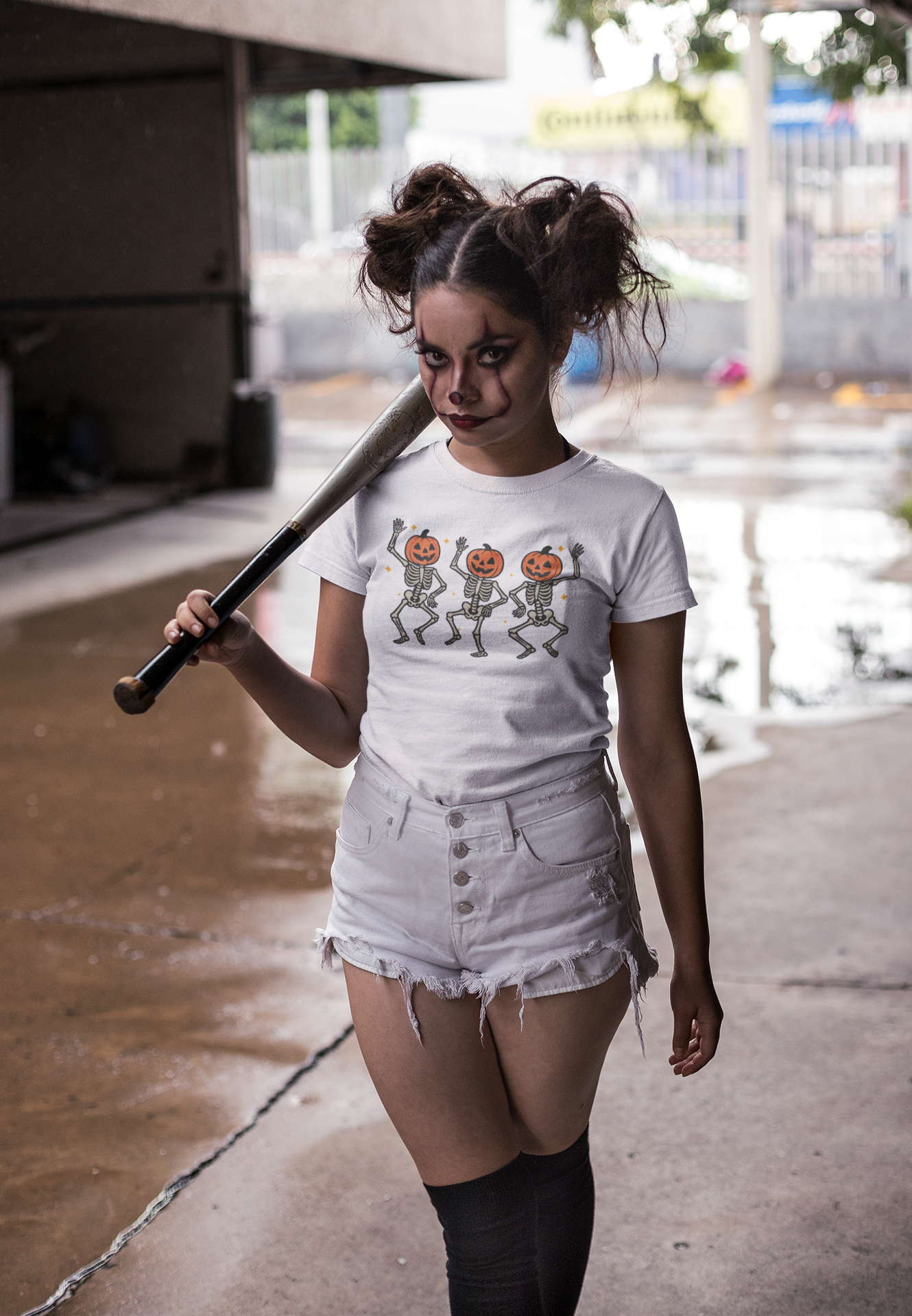 - Halloween-themed dancing skeletons and pumpkin design